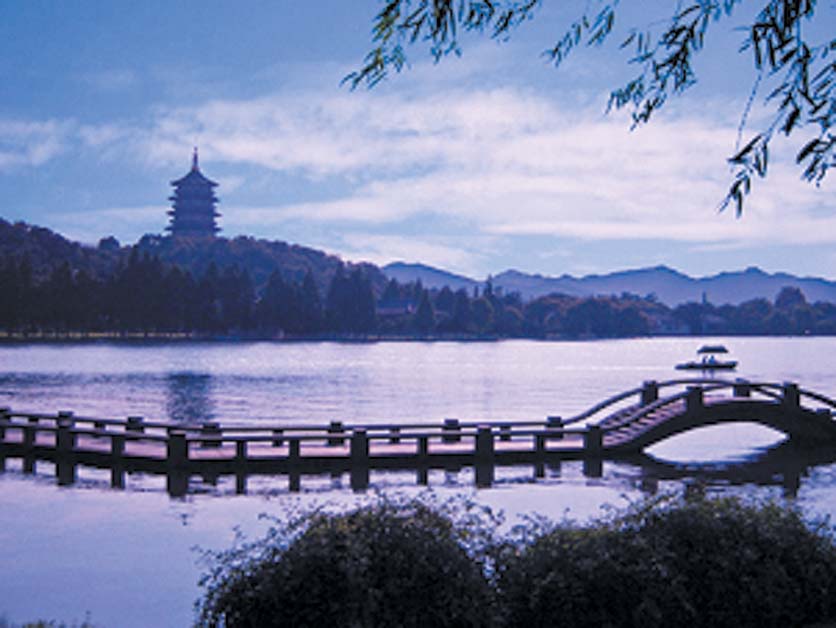 注释:※杭州西湖位于浙江省杭州市西部,旧称武林水,也称西子湖,是江南三大名湖之一。苏堤春晓、曲院风荷、平湖秋月、断桥残雪、柳浪闻莺、花港观鱼、雷峰夕照、双峰插云、南屏晚钟和三潭印月即为著名的“西湖十景”。